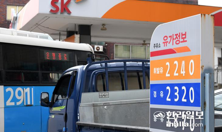 28일 제주시 한 주유소 가격표시판에 휘발유는 ℓ당 2240원, 경유는 2320원이라고 붙어있다. 이날 도내 주유소 평균가격은 ℓ당 휘발유 2214원으로 처음 2200원을 넘어서며 전국에서 가장 비쌌다. 경유가격도 하룻새 45원 올라 2270원으로 가장 비쌌다. 강희만기자