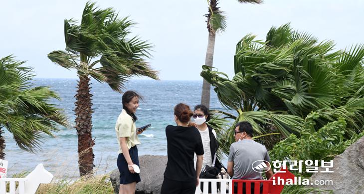 제주전역에 강풍이 몰아친 28일 제주시 이호해수욕장 주변 워싱턴야자수가 심하게 흔들리고 있다. 강희만기자