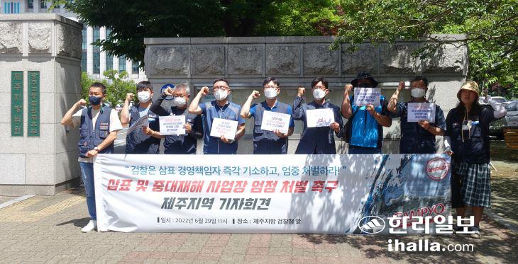 민주노총 제주본부 관계자들이 29일 제주지방검찰청 앞에서 기자회견을 열고 중대재해 사고에 대한 엄정한 처벌을 요구했다. 김도영기자
