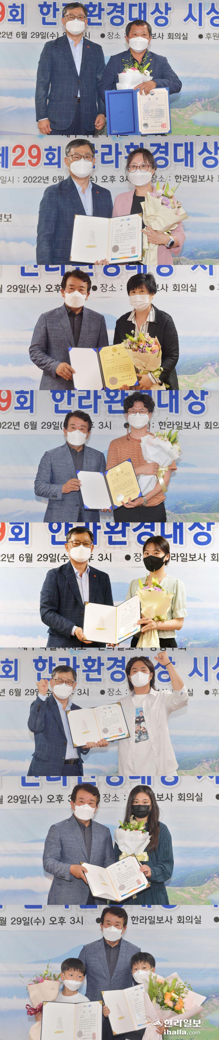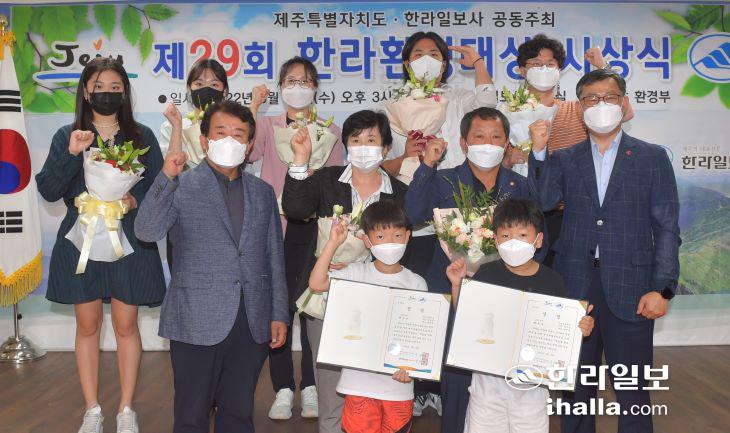 다음은 수상자 ▶한라환경실천상 ▷최우수상 부산광역시 수영구청 ▷우수상 곽민진 동원고등학교 교사 ▶한라환경지킴이상 ▷최우수(학교) 봉은중학교 ▷최우수(교사) 윤대성 한별고등학교 교사 ▶한라환경 UCC 공모전 ▷최우수상(일반 및 대학) 하늘색 팀(모소연 외 3명) ▷최우수상(고등부) 이지원(청주고) ▷최우수상(중등부) 양세린(서울국제학교) ▷최우수상(초등부) 박민준·박서준(서호초).