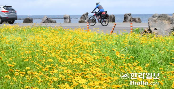 30일 제주시 한림읍 해안도로에 노랗게 물든 금계국을 배경으로 관광객이 라이딩을 즐기고 있다. 이상국기자