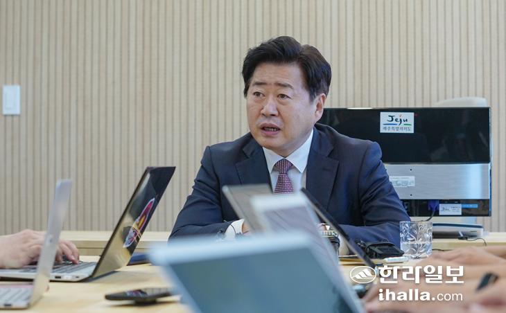오영훈 지사는 1일 취임식 이후 제주도청 지사 집무실에서 기자 간담회를 가졌다. 강다혜기자