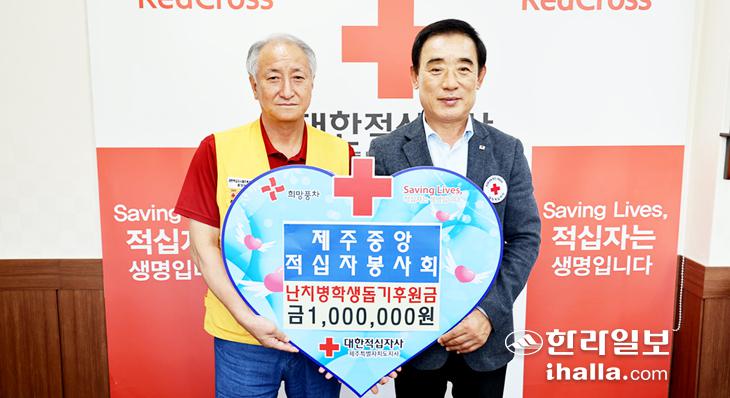 제주중앙적십자봉사회(회장 이수철)는 5일 대한적십자사제주특별자치도지사(회장 오홍식)를 방문해 도내 난치병 학생 돕기 성금 100만원을 기탁했다.