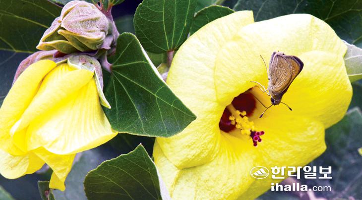 5일 제주시 조천리 인근 도로변에 환경부 지정 멸종위기 야생식물 2급인 황근이 만개하자 팔랑나비 한마리가 찾아와 꿀을 따먹고 있다. 강희만기자