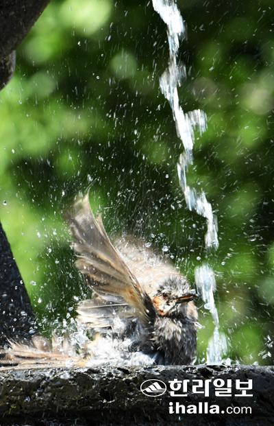 연일 폭염날씨가 이어진 5일 제주도민속자연사박물관 해녀 분수에 무더위에 지친 직박구리가 찾아와 목욕을 하고 있다. 강희만기자
