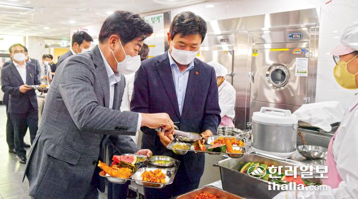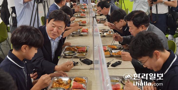 신임 오영훈 제주도지사(왼쪽)와 김광수 제주도교육감(오른쪽)이 6일 오전 한라중학교를 찾아 학교급식을 체험하고 있다. 이상국기자