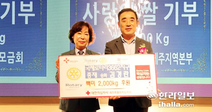 국제로타리3662지구(총재 김경란)는 최근 대한적십자사 제주특별자치도지사(회장 오홍식)에 취약계층 지원을 위한 백미 2000㎏(660만원 상당)을 기탁했다.
