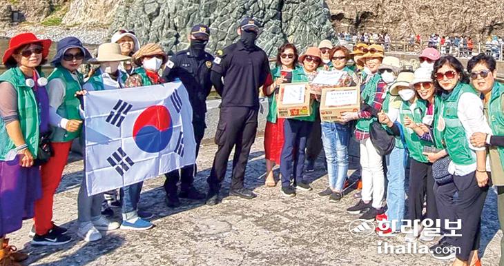 제주시 외도동(동장 한지연)과 새마을부녀회(회장 강길선)는 지난 2일 회원18명과 함께 대한민국 최동단 독도를 방문해 24시간 해안 경계 임무를 수행하고 있는 독도수비대에 위문 물품을 전달했다.