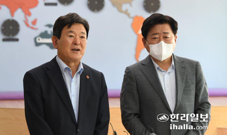 김광수 제주도교육감(왼쪽)과 오영훈 제주도지사(오른쪽)가 지난 6일 한라중학교를 찾아 학교급식을 체험하고 제주 친환경·무상급식비 추경예산 증액 편성 합의를 발표하고 있다. 이상국기자