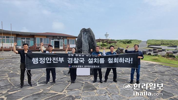 경찰 노조 격인 제주동부·서부·서귀포경찰서 직장협의회는 8일 마라도 치안센터와 최남단 표식비 등에서 경찰국 반대 시위를 전개했다. 제주경찰 직협