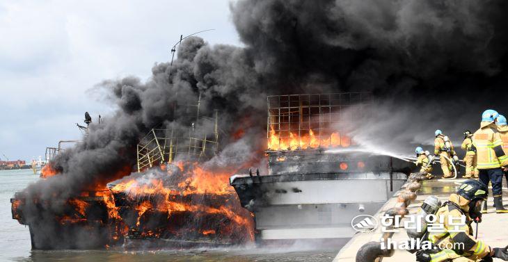지난 7일 제주시 한림읍 한림항에서 발생한 선박 화재를 소방대원들이 진압하고 있다. 이상국기자