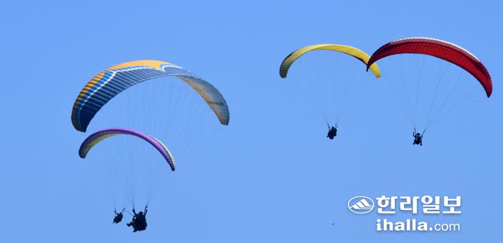 9일 제주시 조천읍 서우봉을 찾은 관광객들이 패러글라이딩에 올라 아름다운 제주 바다 위를 비행하고 있다. 이상국기자