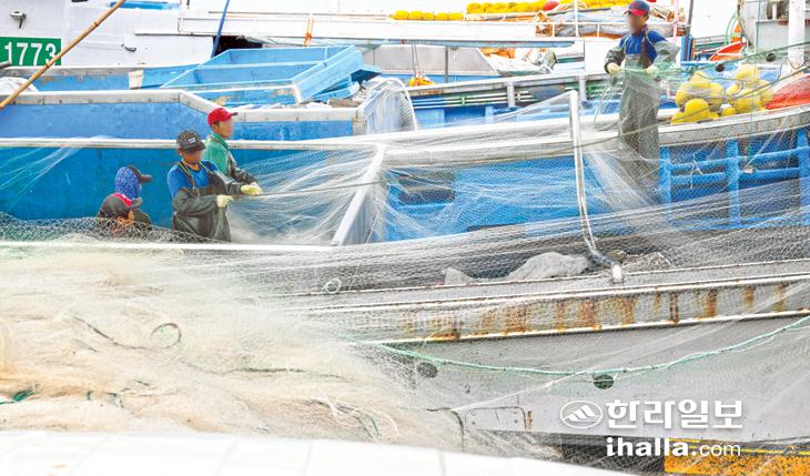 11일 제주시 한림읍 한림항에서 어민들이 조업에 나서기 위해 그물정리 작업을 하고 있다. 강희만기자
