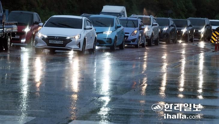긴 기다림끝에 장맛비가 내린 11일 오전 제주시 애조로에서 차량들이 전조등을 켠채 운행하고 있다. 강희만기자