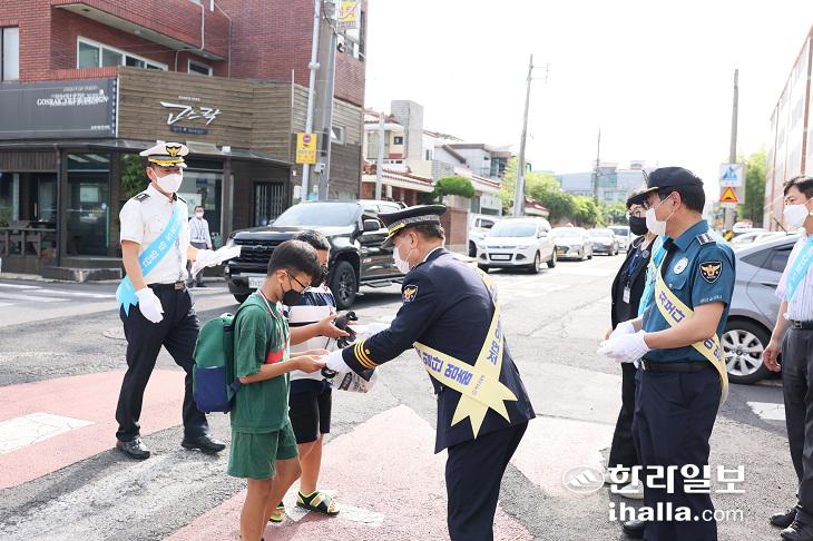 제주경찰청은 보행자 보호의무를 강화하는 도로교통법 시행 첫 날인 12일 신제주초와 동광초, 한라초, 서귀포시 중앙로터리 등에서 홍보 캠페인을 전개했다.