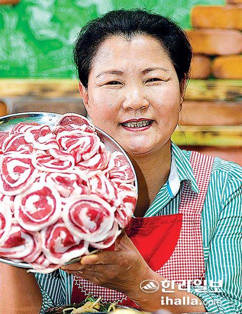 '신제주촌오리' 주인장 양선희 씨가 '오리 차돌'을 들고 있는 모습. 한라일보 DB