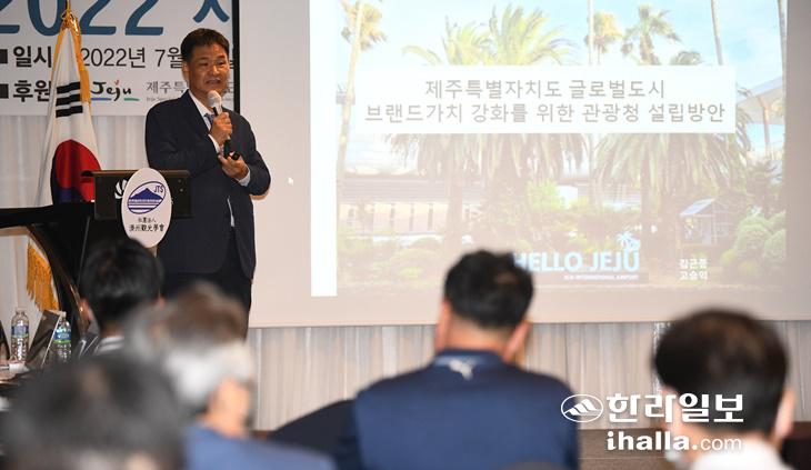 12일 제주시 오션스위츠호텔 카멜리아홀에서 열린 '제주, 세계적 명품관광도시로의 도약'이라는 주제로 열린 '2022 제주관광학회 하계 학술 세미나'에서 김근종 건양대학교 교수가 '제주특별자치도 글로벌 도시 브랜드 가치 강화를 위한 관광청 설립 방안'이란 주제로 발표를 하고 있다. 이상국기자