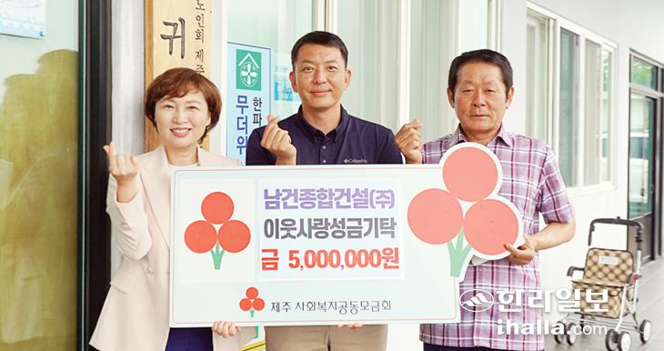 남건종합건설(주)(대표 김준수)은 지난 11일 제주시 애월읍 상귀리사무소에서 관내 어려운 이웃을 위한 이웃사랑 성금 500만원을 제주사회복지공동모금회(회장 강지언)에 기탁했다.