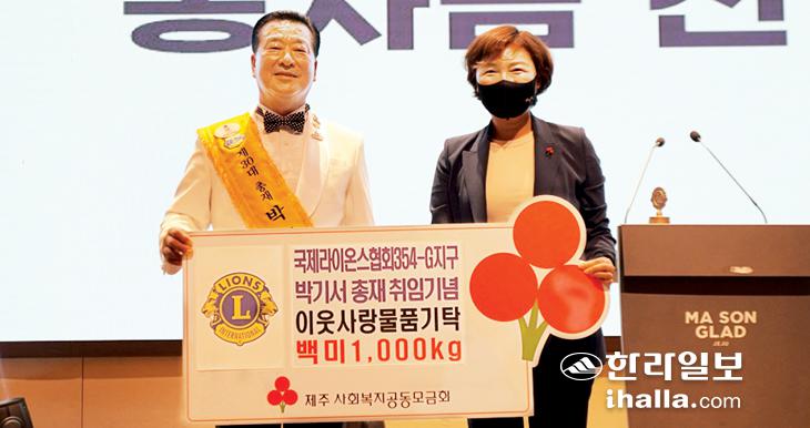 국제라이온스협회 354-G지구(총재 박기서)는 지난 10일 메종글래드 제주 컨벤션홀에서 '제29대·30대 총재 이·취임식' 행사를 열고 사랑의 쌀 1000㎏을 제주사회복지공동모금회(회장 강지언)에 기탁했다.