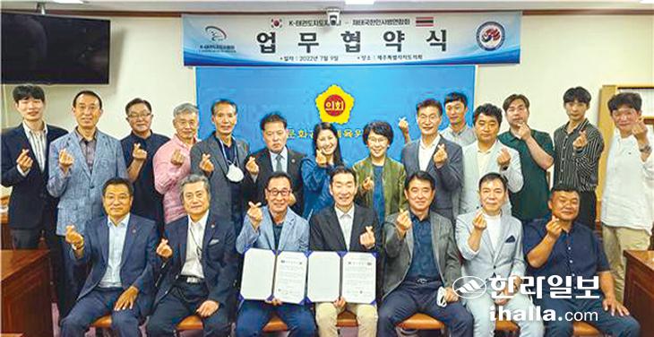 K-태권도지도자협회(회장 최철영)와 재태국한인사범연합회(회장 박종화)는 지난 9일 제주도의회 회의실에서 태국과 제주의 태권도 기술과 지도자양성 및 파견 등 스포츠외교 교류를 위해 업무협약을 체결했다.