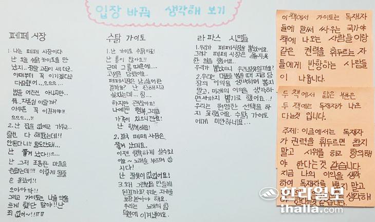 수업 활동으로는 '라파스의 시민들이 모두 행복할 수 있는 법 조항 만들기' 또는 '수탉 가이토, 페페시장, 라파스시민의 입장이 되어서 글쓰기'를 했다. '입장 바꿔 글쓰기'로 서로의 입장에 공감하고 감정이입하는 과정을 경험해 보았다. 그리고 판사가 되어 판결문을 작성해 보는 것도 색다른 경험이 될 수 있다.