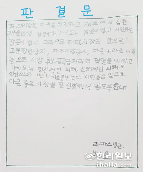 관련 책 읽고 질문 통해 학생들의 생각 넓히기법 조항 만들기, 판결문 작성 등 수업 활동 전개입장 바꿔 글쓰기로 공감·감정이입 과정 경험