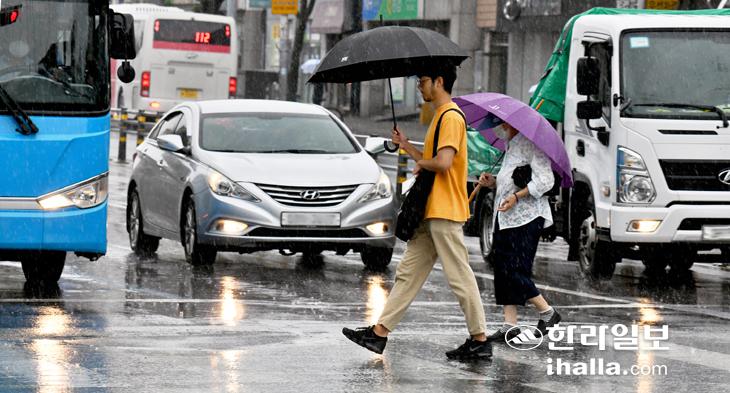 장맛비가 쏟아진 14일 오전 우산을 쓴 행인들이 제주시 오라동 버스터미널 앞 횡단보도를 건너고 있다. 강희만기자