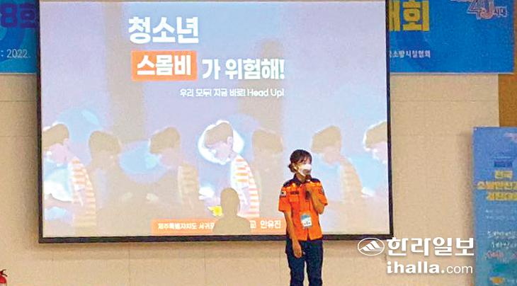제주 대표로 출전한 안유진 소방장은 스마트폰 사용 중 사고 위험성을 알리는 '초등학생 스몸비(스마트폰을 들여다보며 길을 걷는 사람)'를 주제로 강의를 진행해 장려상(한국소상시설협회장상)을 수상했다.