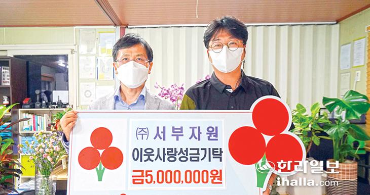(주)서부자원(대표 양영순)은 지난 15일 이웃사랑 성금 500만원을 제주사회복지공동모금회(회장 강지언)에 기탁했다. 이번 성금은 도내 복지사각지대 발굴과 해소에 사용될 예정이다.