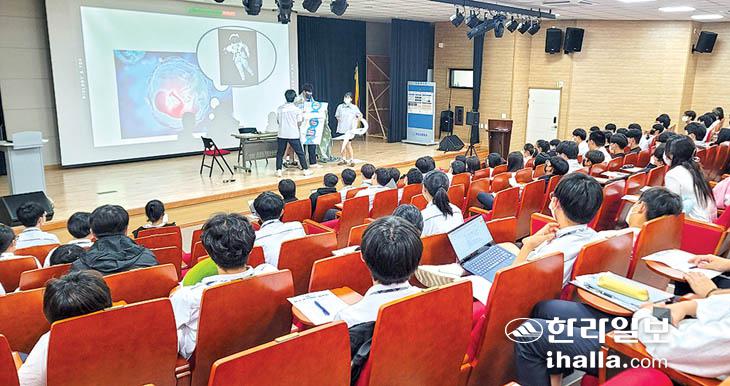 IB월드스쿨인 표선고등학교(교장 임영구)의 2학년 학생들은 지난 13일 '융합탐구 프로젝트'를 실시했다. 이날 16팀 52명은 자신의 진로, 관심 분야와 밀접한 IB 교과 과목을 선택하고 지난 3월부터 이를 중심으로 다른 과목과 연계·융합해온 과정을 바탕으로 영화 시사회를 열거나 창작한 영어 소설을 발표했다.