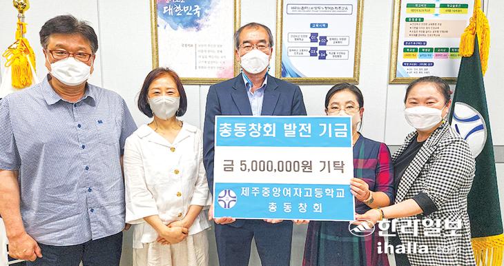 제주중앙여자고등학교 총동창회(회장 양미지, 제8회 졸업생) 임원들은 지난 18일 제주중앙여고(교장 박종관)를 방문해 회원들로부터 자발적으로 모금한 장학금 500만원을 학교발전기금으로 기탁했다.