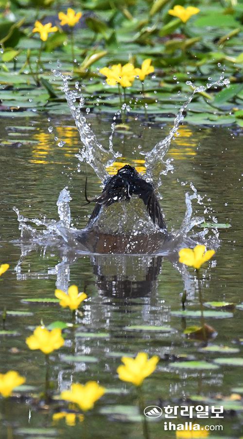 폭염 날씨를 보인 19일 제주시 조천읍 남생이못에서 제비들이 연신 목욕을 하며 더위를 식히고 있다. 강희만기자