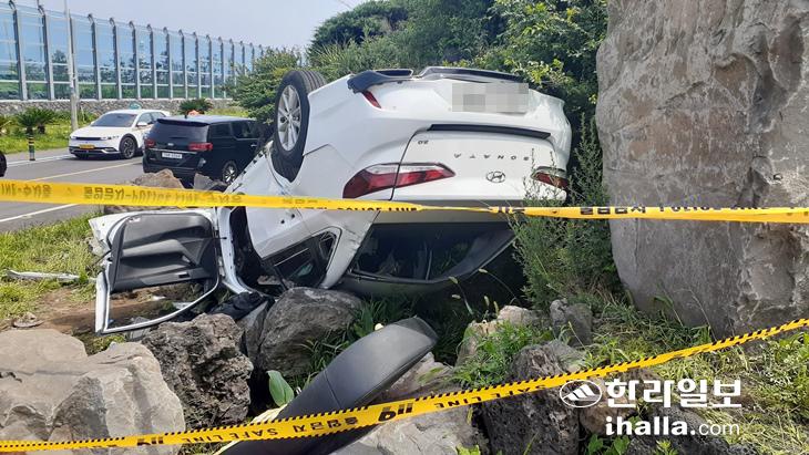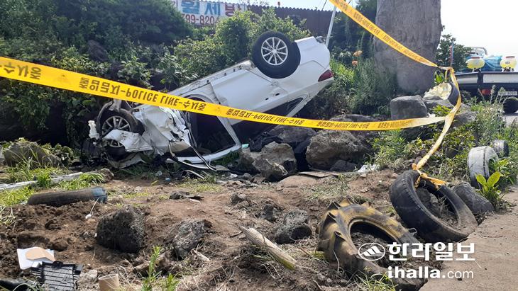 20일 7명의 사상자를 낸 제주시 애월읍 고내리 해안도로 렌터카 전복사고 현장. 강희만기자