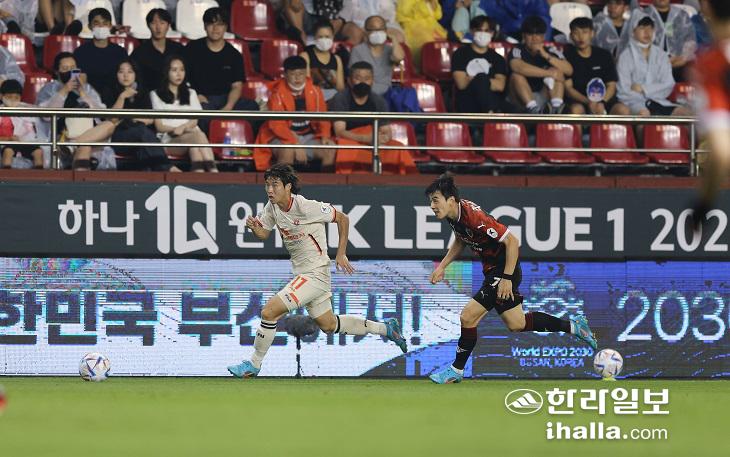 지난 16일 포항스틸야드에서 열린 하나원큐 K리그1 2022 22라운드 포항과 제주의 경기에서 제주의 안현범이 상대진영을 돌파하고 있다. 한국프로축구연맹 제공