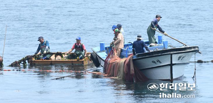 20일 제주시 구좌읍 종달리 바다에서 어민들이 고기를 잡기 위해 그물을 설치하고 있다. 이상국기자