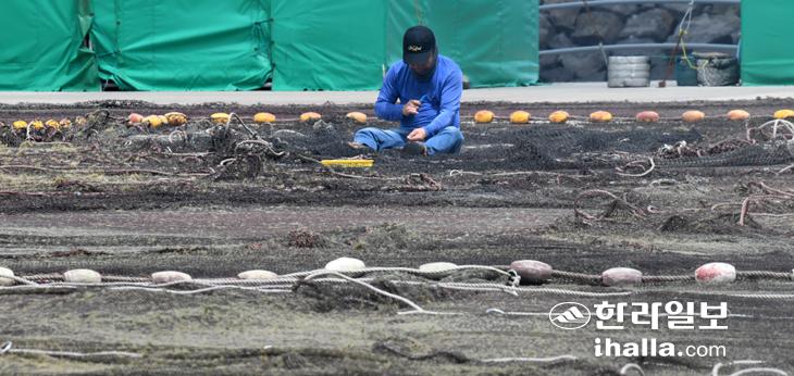 21일 제주시 한림항에서 한 어민이 그물 수선 작업으로 분주한 시간을 보내고 있다. 이상국기자