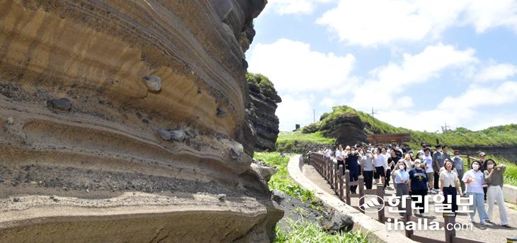 21일 제주시 한경면 수월봉을 찾은 수학여행객들이 화산쇄설층을 구경하고 있다. 이상국기자