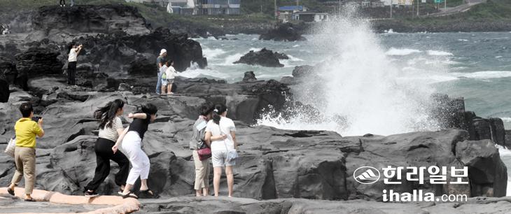 강풍이 불며 비가 오락가락한 21일 제주시 애월읍 구엄리 해안을 찾은 관광객들이 높은 파도가 몰아치는 바다를 바라보며 제주여행을 즐기고 있다. 이상국기자