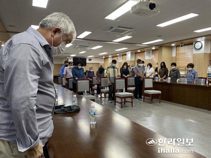 제주4·3 희생자 유족들이 묵념을 하고 있다. 송은범기자