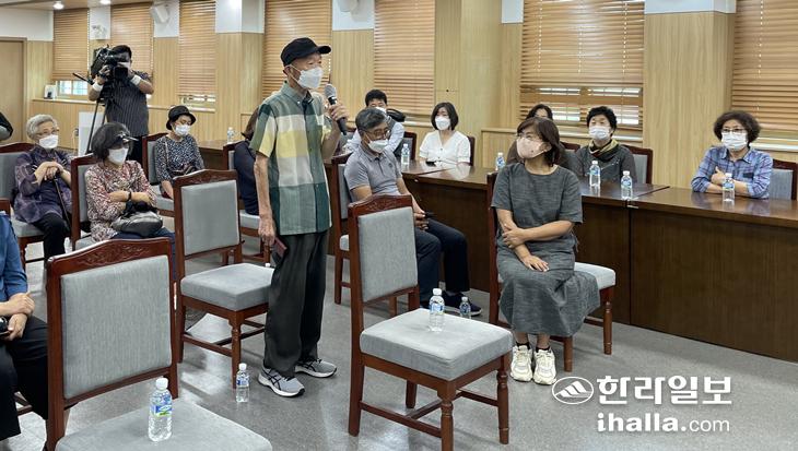 22일 제주도의회 의원회관 대회의실에서 제주4·3 희생자 유족이 검찰의 사상 검증에 대해 발언하고 있다. 송은범기자
