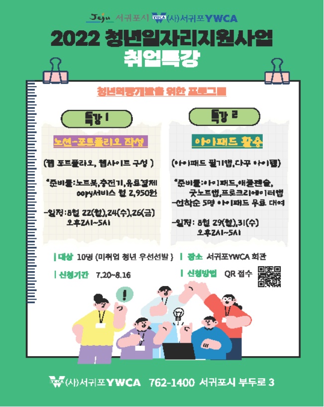 오는 8월 22일부터 5일간 이뤄지는 이번 취업특강은 '노션-포트폴리오 작성'과 '아이패드 활용'에 중점을 둔다. 모집 인원은 강의당 10명씩 모두 20명이며 강의는 서귀포YWCA회관에서 진행된다.