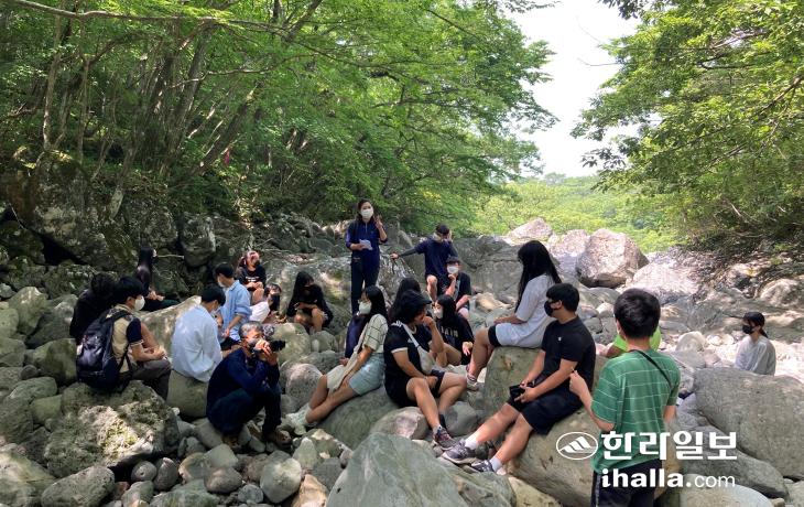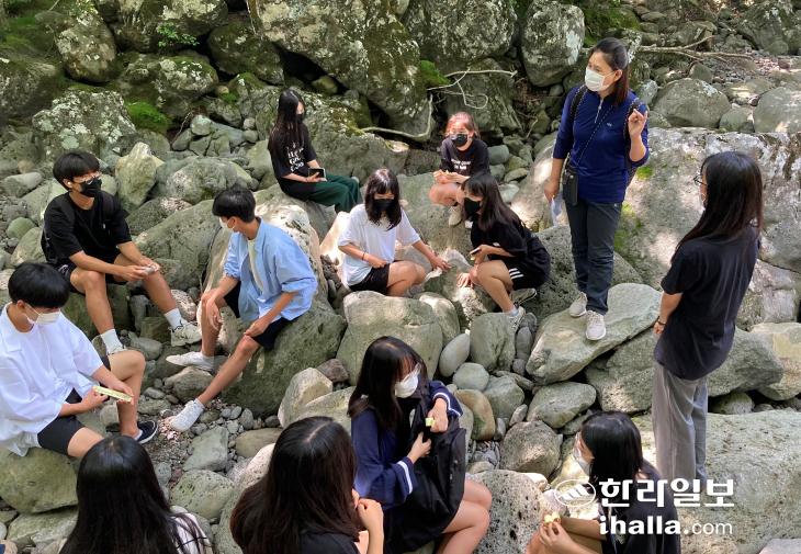 제주도청소년활동진흥센터 민은화 팀장의 지도에 따라 함께 이야기를 나누는 무릉중학교 학생들.