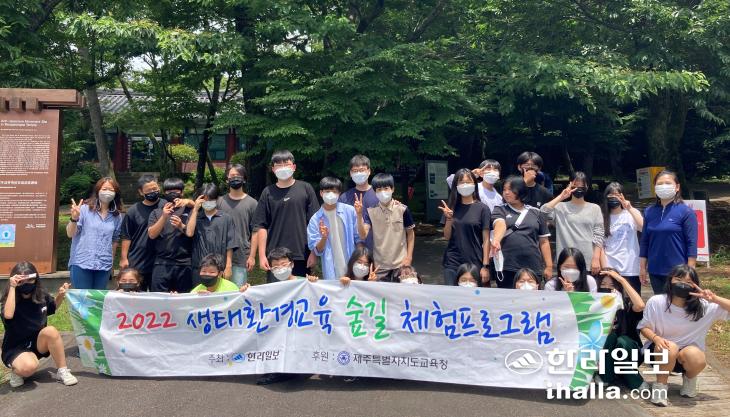 무릉중학교 생태환경동아리 학생들이 숲길체험 프로그램을 마치고 기념사진을 찍고 있다.