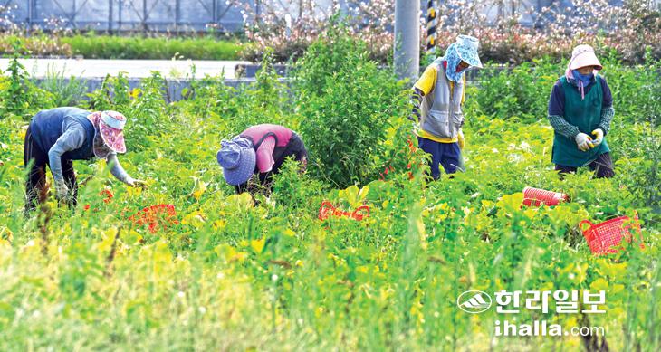 25일 제주시 조천읍 진드르 한 농경지에서 농민들이 무더운 날씨속에 단호박을 수확하고 있다. 강희만기자