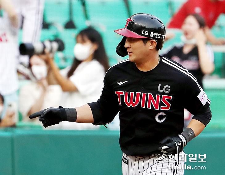 26일 인천 SSG 랜더스필드에서 열린 프로야구 SSG 랜더스와 LG 트윈스의 경기. 2회초 LG 공격 무사 상황에서 LG 오지환이 우월 홈런을 친 뒤 세리머니를 하며 베이스를 돌고 있다. 연합뉴스