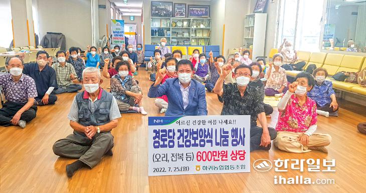 제주시 하귀농협(조합장 강병진)은 지난 25일 하귀2리와 번대동 경로당에서 '사랑의 보양식 나눔행사'를 갖고 코로나19 장기화와 무더위로 몸과 마음이 지친 어르신들의 안부를 묻고 건강을 기원했다.