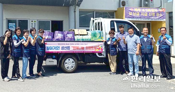 서귀포시 성산읍은 지난 25일 성산읍지역사회보장협의체 위원 8명이 참가한 가운데 '행복나눔 희망트럭 사업'을 운영했다. 지역 내 취약계층 20가구를 방문해 10만원 상당의 생필품을 전달하며 안부를 확인했다.