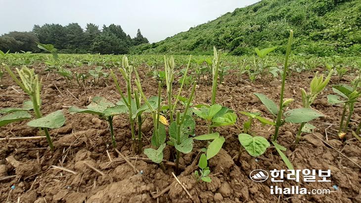 26일 제주시 애월읍 유수암리 한 농경지에 마른 장마속에 어렵게 올라온 콩새싹이 노루들이 훑고 가는 바람에 밑둥지만 남았다. 강희만기자