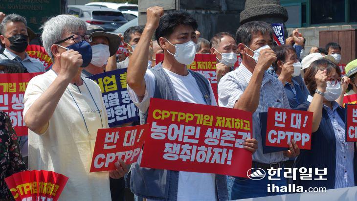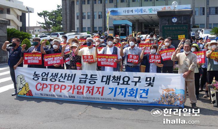 제주지역 농민 단체가 27일 제주도청 앞에서 농업 생산비 급등에 따른 대책 마련을 요구하고 있다. 김도영기자