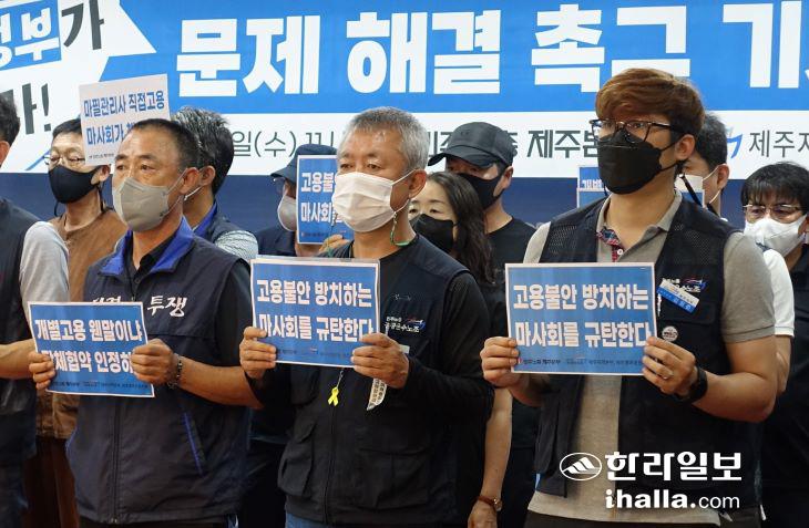 공공운수노조 제주경마공원지부 등 노동 단체들이 27일 제주도의회에서 기자회견을 열고 있다. 김도영기자